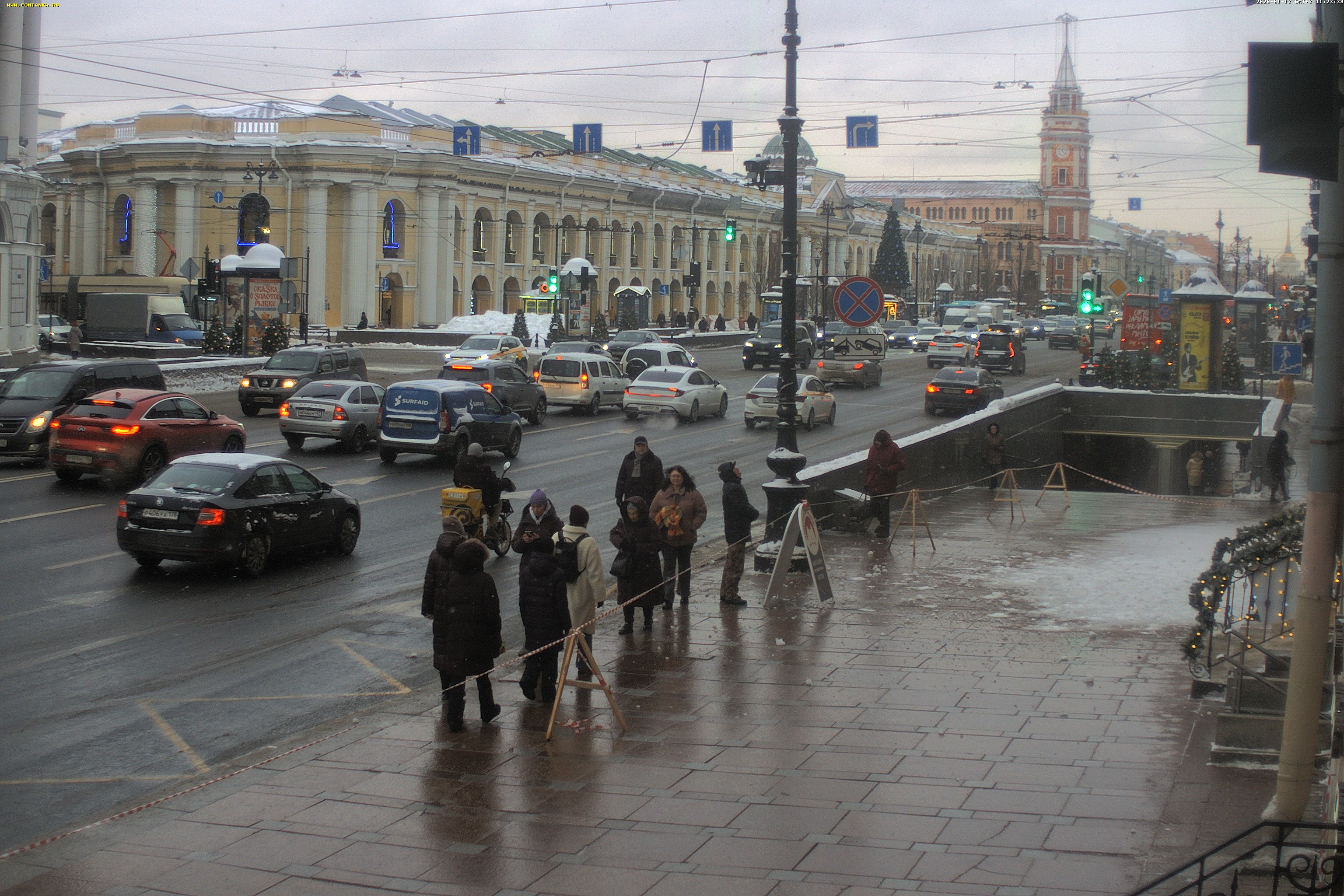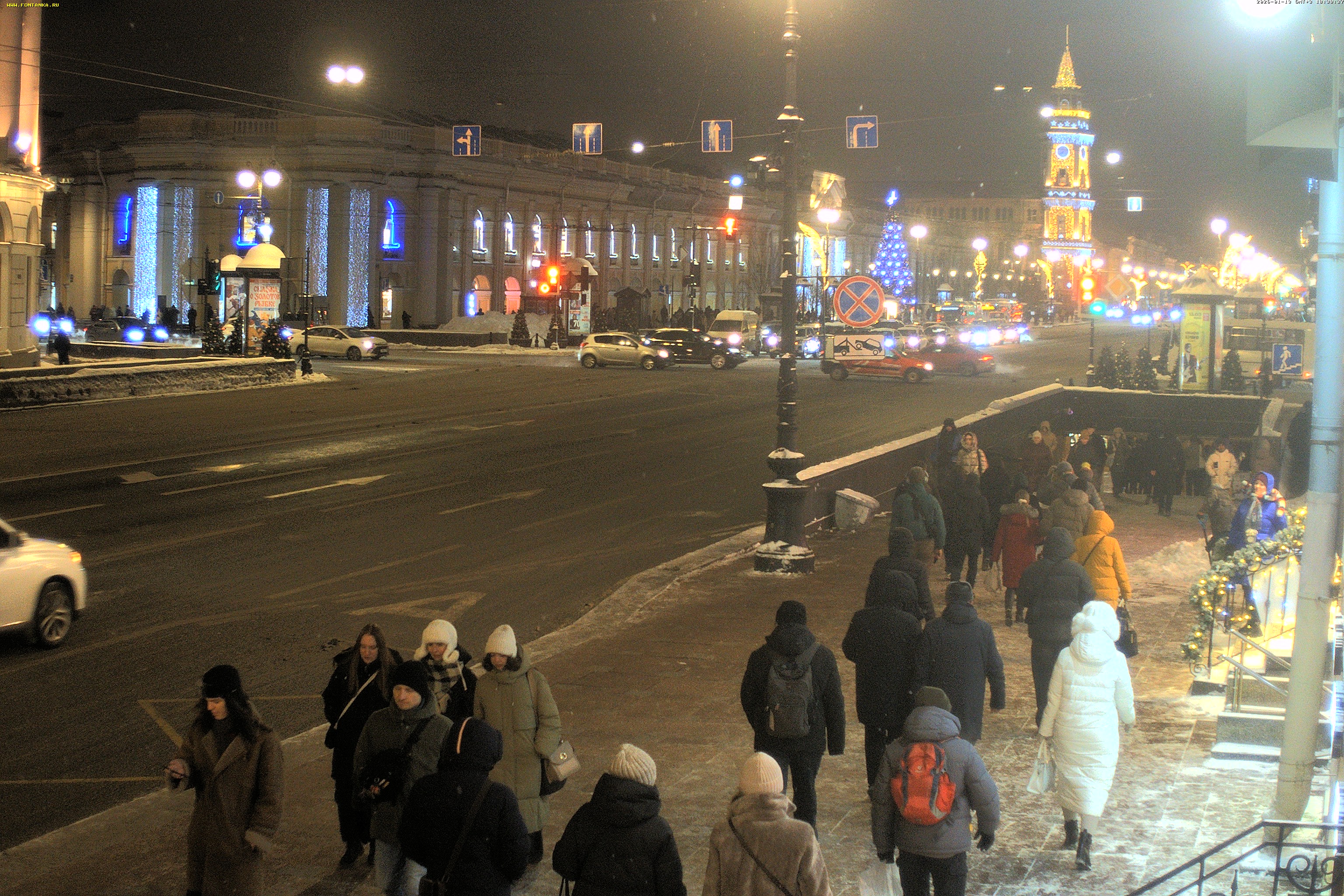 Новогодняя обстановка на Невском проспекте у Казанского собора