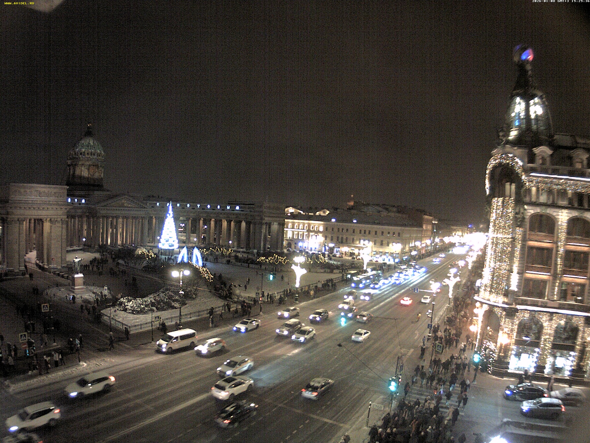 Новогодняя обстановка на Невском проспекте у Казанского собора